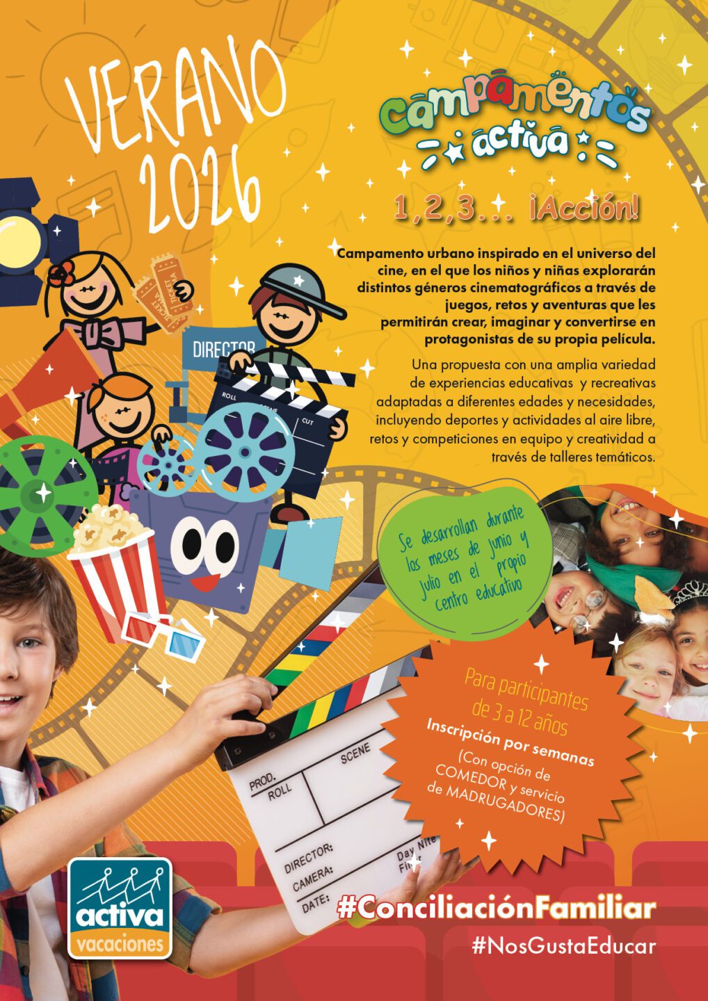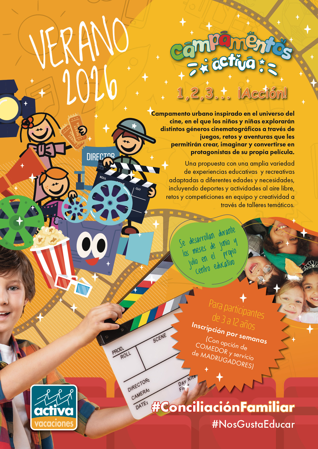 Durante el mes de julio daremos el salto a la gran pantalla con nuestro campamento Activa inspirado en el universo del cine: 1, 2, 3… ¡Acción! con actividades variadas, dinámicas y adaptadas por edades.