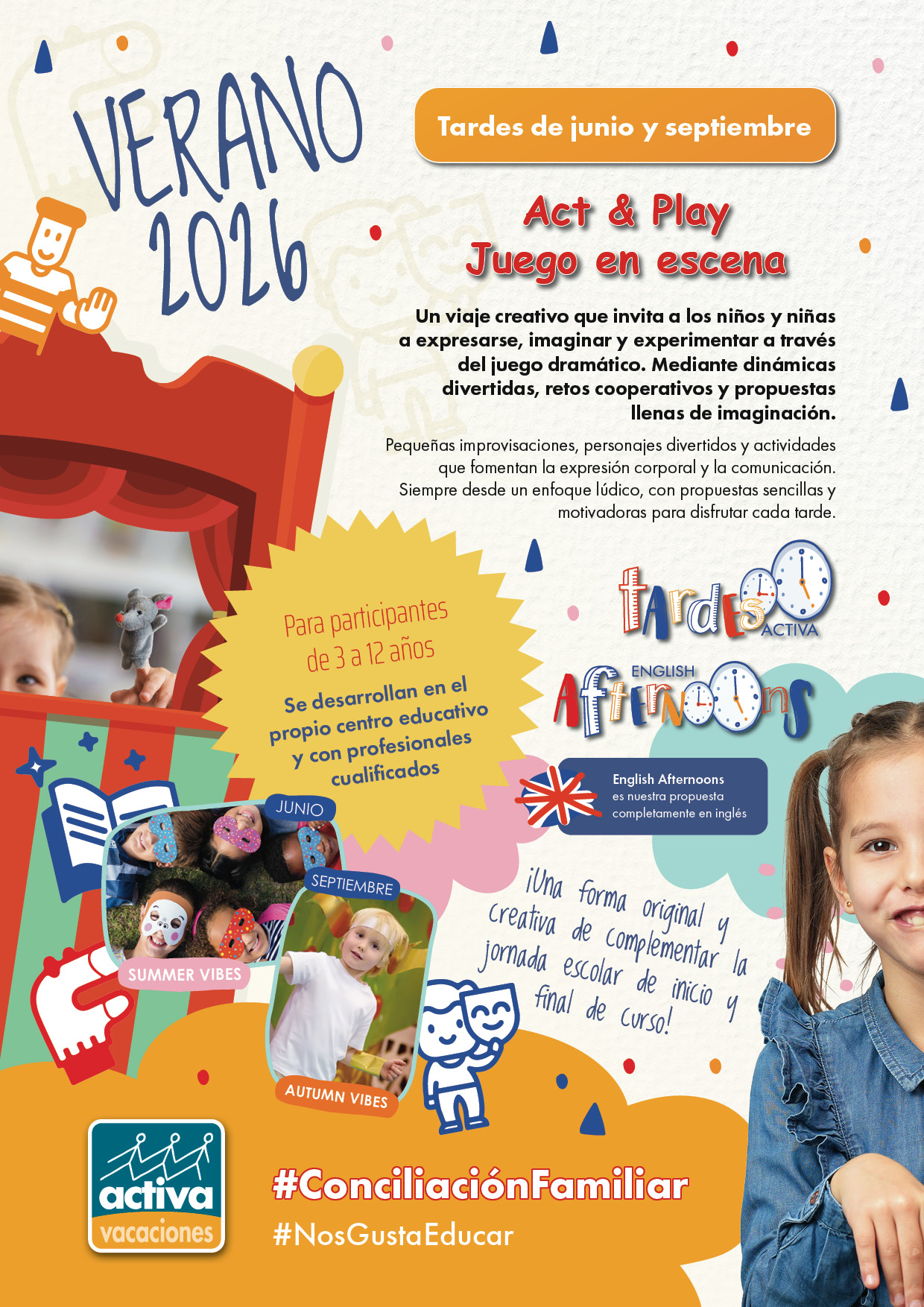 ¡Este año hemos preparado un verdadero juego en escena (Act&Play)! Para los meses de junio y septiembre en los que el horario escolar se reduce, proponemos divertidas actividades de tarde que completan la jornada escolar. ¡Y pueden desarrollarse también en inglés!